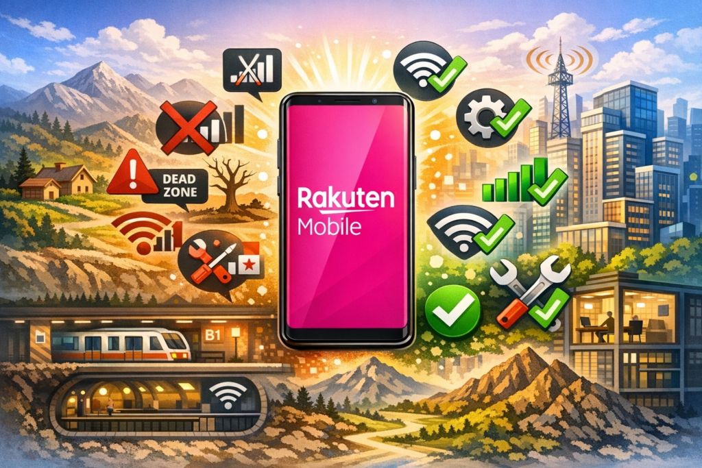 楽天モバイルは2020年にサービスを開始した後発キャリアです。ドコモ・au・ソフトバンクが20〜30年かけて整備してきた基地局網と比べると、地方・郊外・山間部のカバーがまだ不十分なエリアがあります。特に地下・建物内・郊外では繋がりにくいと感じるユーザーが多いです。